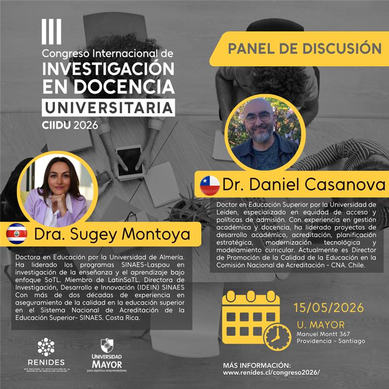 SINAES comparte información sobre el Tercer Congreso Internacional de Docencia Universitaria CIIDU, que se llevará a cabo el 14 y 15 de mayo en la Universidad Mayor, en Santiago de Chile.